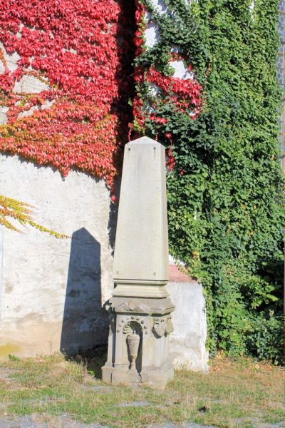 kräftiger Obelisk auf quadratischem Sockel, umlaufende Girlanden, Frontseite mit ädikulaförmig umrahmter Nische, darin Kelch unter Muschelkalotte, darüber Engelskopfgiebel (nur tlw. erhalten)