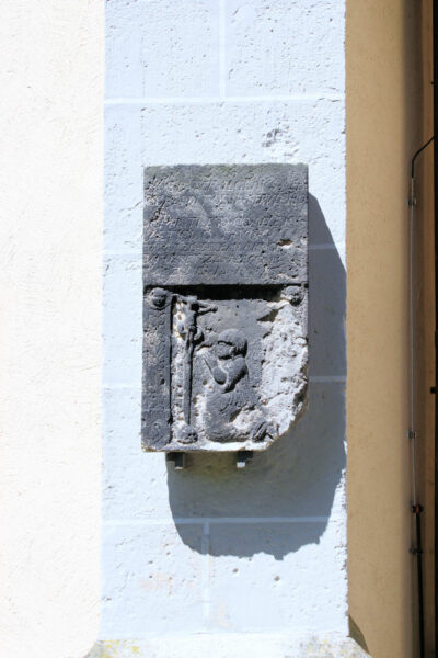- Rechteckplatte, oben vertiefte Inschrift, unten Relief
