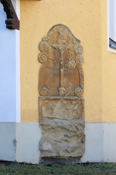 - an der Außenwand der Laurentiuskirche in Leutzsch angebrachter, aufrechter rechteckiger Grabstein mit gekreuzigtem Jesus und Wolken