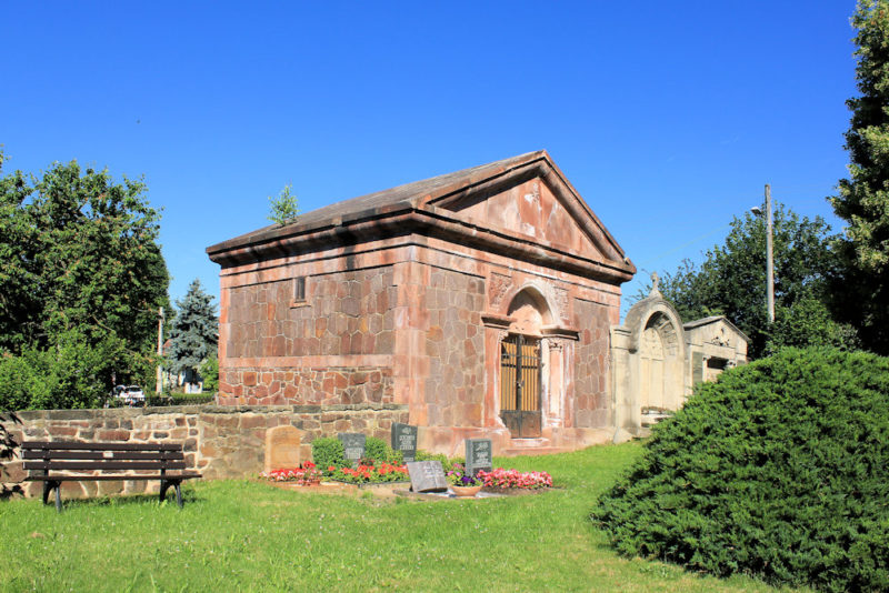 - Grufthaus mit romanisch anmutendem Portal, Dreiecksgiebel und kräftigem Gesims