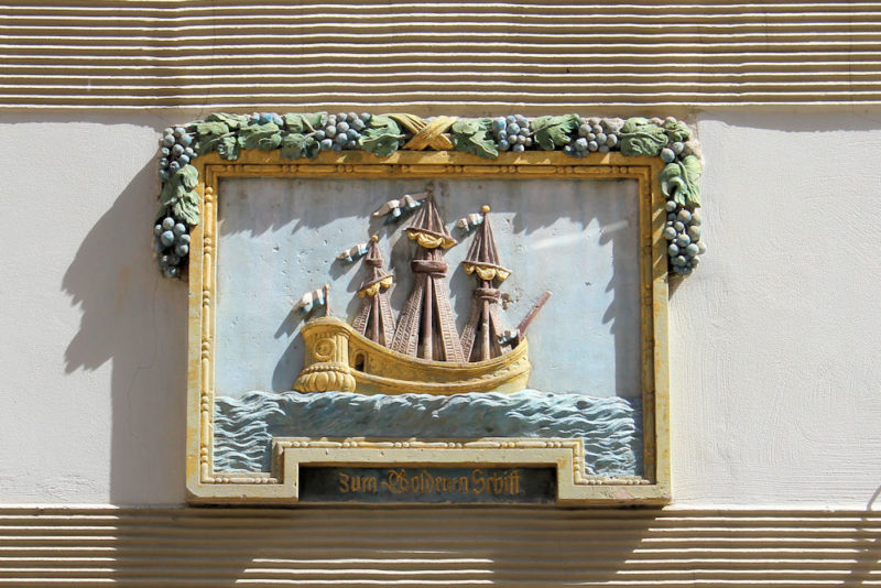 - Die Haustafel „Zum goldenen Schiff“ in Leipzig kann besichtigt werden.