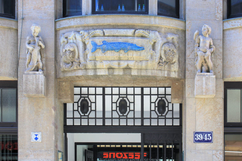 Das Hauszeichen „Blauer Hecht“ befindet sich in der Nikolaistraße zwischen Nikolaikirche und Hauptbahnhof.
