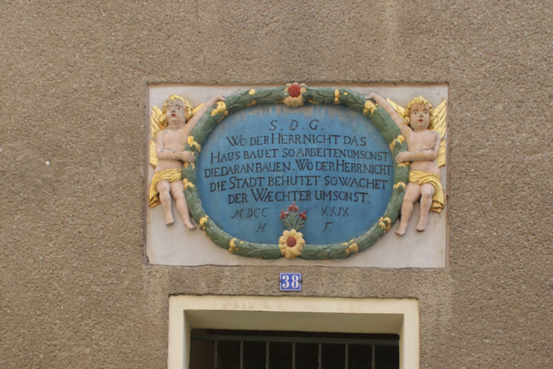 - S. D. G. /Wo der Herr nicht das / Haus bauet so arbeiten umsonst / die daran bauen. Wo der Herr nicht / die Stadt behütet so wachet / der Waechter umsonst. / MDCCXXIX / H. F.