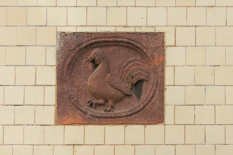Das Hauszeichen „Zum Goldenen Hahn“ befindet sich in der Jägerhofpassage im ersten Hof von der Hainstraße zwischen Markt und Brühl in Leipzig.