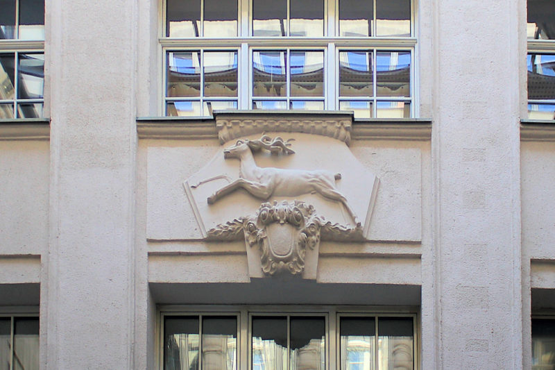 - Im Hof von Stentzlers Hof angebrachtes Hauszeichen eines springenden Hirschs vom Vorgängerbau Petersstraße 37.