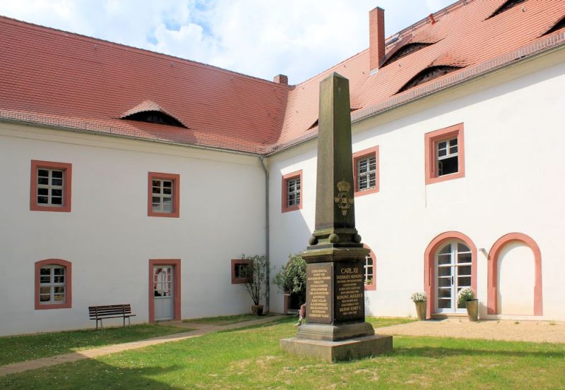 Der Jubiläumsobelisk von Altranstädt steht im Hof des Schlosses Altranstädt.