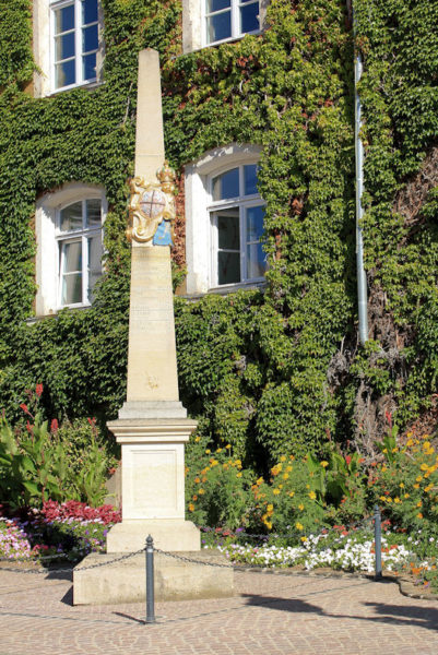 - Postament auf Unterbau, Abdeckplatte, Obelisk mit kursächsischem und polnisch-litauischem Wappen