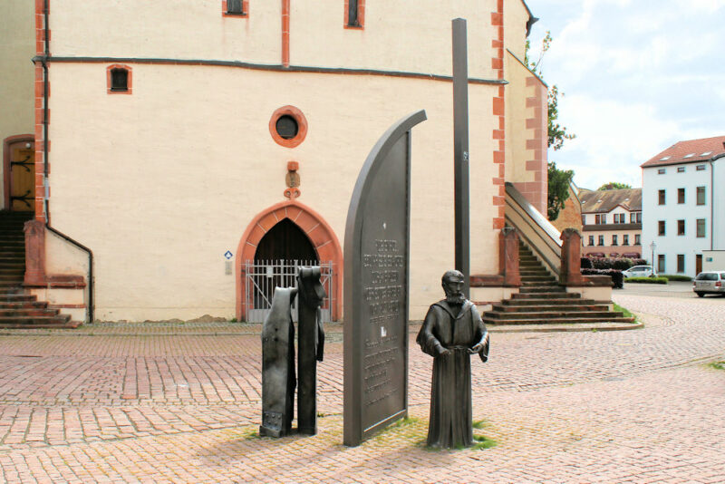 - Figur des Martin Luther, dahinter Tafel mit Worten seiner Predigt in Borna 1523