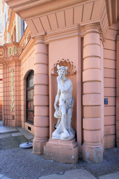 - schreitende Merkurstatue in einer Gebäudenische