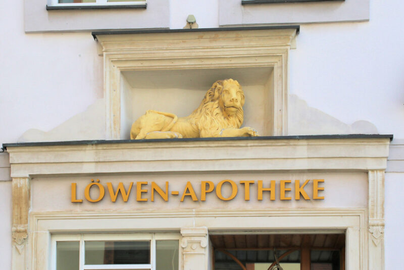 Plastik an der Löwen-Apotheke in Borna (bei Leipzig)