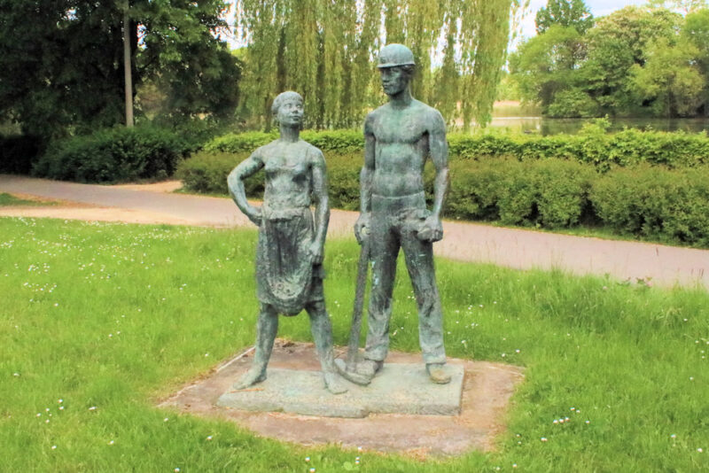 Die Plastik „Ziebelfrau und Bergmann“ befindet sich an Breiten Teich in Borna.