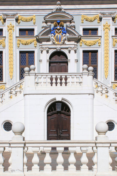 - rundbogiges Portal von korinthischen Pilastern gerahmt, doppelter Segmentbogengiebel, unterer Giebel gesprengt mit Leipziger Wappen