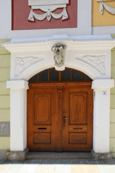 - Korbbogenportal mit waagerechter Verdachung, Schlussstein mit Kopf mit Federhelm