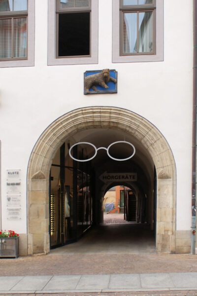 Das Portal und das Hauszeichen befinden sich am Haus Jakobstraße 3 nahe dem Rathaus in Naumburg.