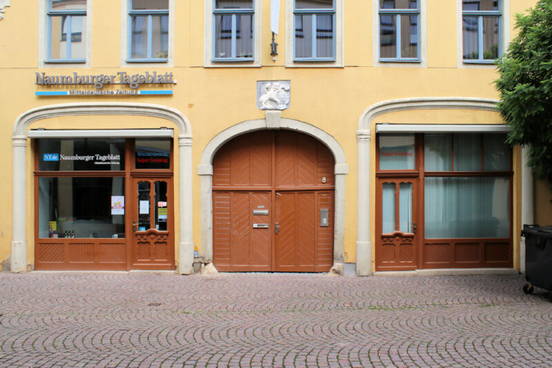 Das Portal und das Hauszeichen „Zum weißen Löwen“ befinden sich zwischen der Wenzelskirche und dem Lindenring in Naumburg.
