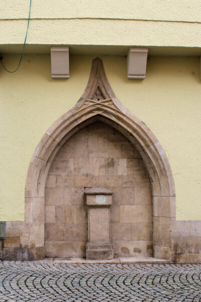 - spitzbogiges Portal eines Vorgängerbaus (vermauert) mit sich kreuzenden Stäben