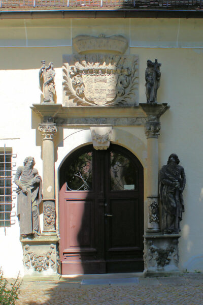 - zwei Postamente, darauf Säulen und Figuren, waagerechte Verdachung mit Wappen von Kurfürst Johann Georg III., Figuren