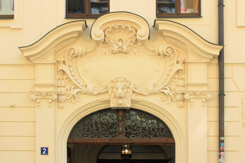 - am einem älteren Wohnhaus angebrachtes Rundbogenportal mit gesprengtem Wellengiebel und Kartusche und Löwenkopf