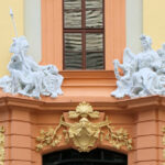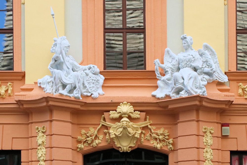 - Hauptportal am Brühl: Segmentbogen mit über Eck gestellten Pfeilern, waagerechter Verdachung, zwei liegenden Figuren und Kartusche,