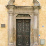 - Renaissance-Rundbogenportal, säulengerahmtes Barockportal mit gesprengtem Giebel