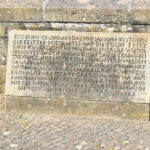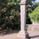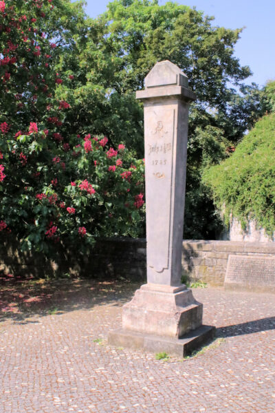 - sich nach oben verbreiternde Stele auf Sockel mit Abschluss, daneben Inschrifttafel