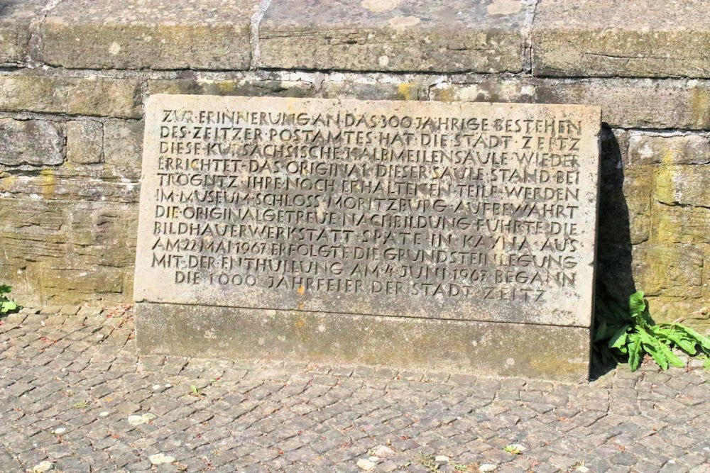 Zur Erinnerung an das 300jährige Bestehen / des Zeitzer Postamtes hat die Stadt Zeitz / diese Kursächsische Halbmeilensäule wieder / errichtet. Das Original dieser Säule stand bei / Tröglitz. Ihre noch erhaltenen Teile werden / im Museum Schloss Moritzburg aufbewahrt. / Die originalgetreue Nachbildung führte die / Bildhauerwerkstatt Späte in Kayna aus. / Am 22. Mai 1967 erfolgte die Grundsteinlegung. / Mit der Enthüllung am 4. Juni 1967 begann / die 1000 Jahrfeier der Stadt Zeitz.