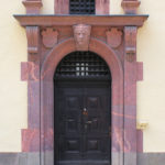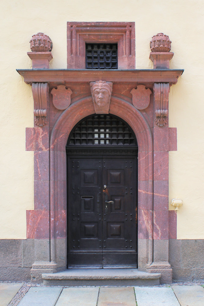 - Hauptportal am Markt: Rundbogenportal, vorgestellt beidseitig zwei ionische Säulen auf kräftiger Basis, waagerechter Abschluss, zwei Gaffköpfe,