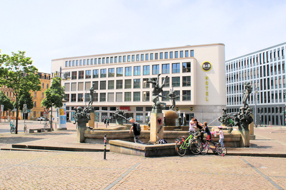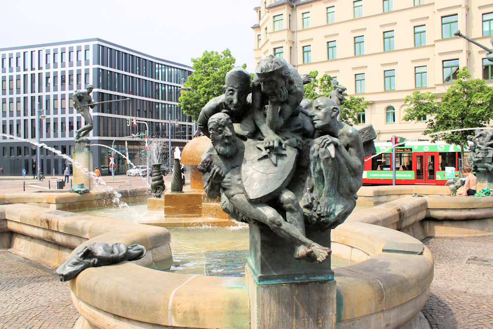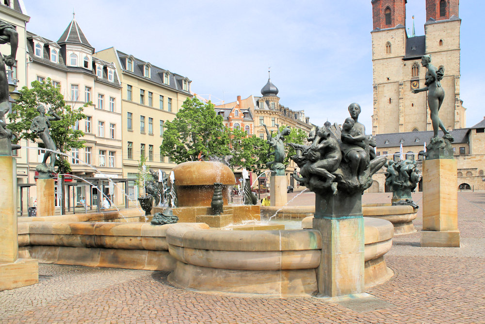 - quadratisches Brunnenbecken mit runden Ausbuchtungen, in der Mitte Wasserspeier, mehrere Stelen mit Darstellungen aus der Stadtgeschichte von Halle (Saale), u.a. Ludwig der Springer, der Schäfer von Trotha, die Saalenixe, Fischerstecher, Kardinal Albrecht und die Halloren