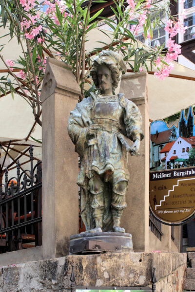 Die Statue steht vor der Weinstube Vincenz Richter nahe der Stadtkirche in Meißen.