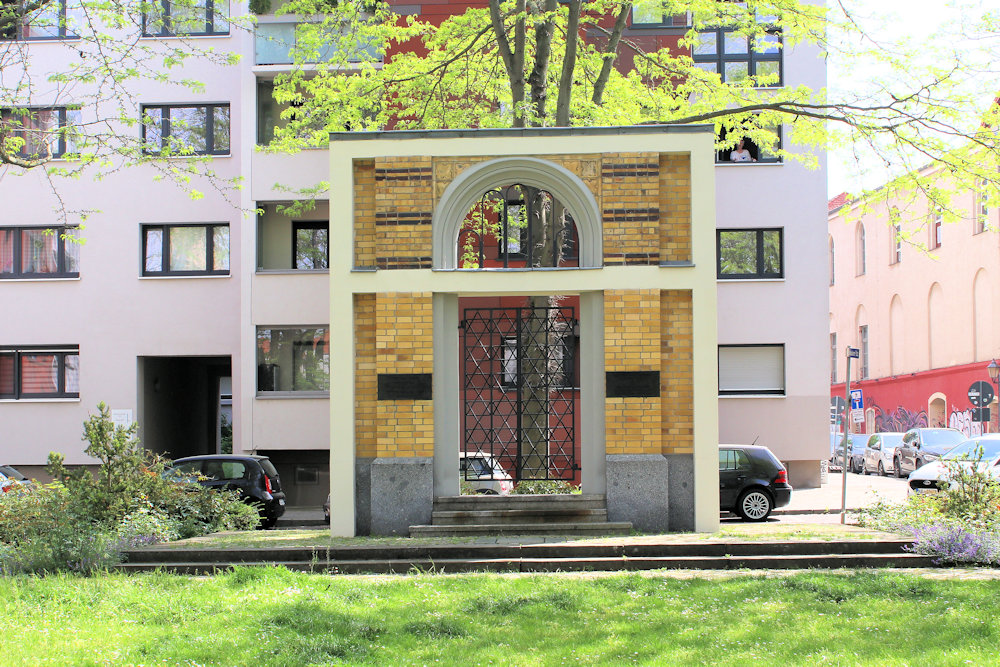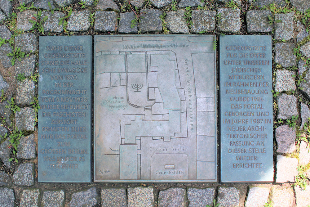 Nahe dieser / Gedenkstätte / stand die halle- / sche Synagoge von 1870. / In der / Pogromnacht / vom 9. Nov. 1938 / wurde sie durch / die Faschisten / zerstört. / Erhalten blieb / nur das / Portal / zum Großen Berlin / 1965 wurde es / Teil einer / Gedenkstätte / für die Opfer / unter unseren / jüdischen / Mitbürgern. / Im Rahmen der / Neubebauung / wurde 1984 / das Portal / geborgen und / im Jahre 1987 / in neuer archi- / tektonischer Fassung an / dieser Stelle / wieder- / errichtet.