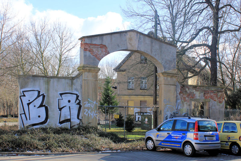 - Der Torbogen des Rittergutes Mockau ist in einem schadhaften Zustand.