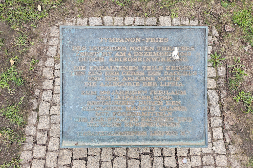 - Tympanon-Fries / des Leipziger Neuen Theaters / zerstört am 4. Dezember 1943 / durch Kriegseinwirkung. / Die erhaltenen Teile zeigen / den Zug der Ceres des Bacchus / und der Ariadne sowie / die Allegorie der Lipsia. / Zum 300jährigen Jubiläum / der Leipziger Oper / restauriert durch den / Bildhauer Markus Gläser / mit Fördermitteln / des Freistaates Sachsen und / privaten Zuwendungen. / Theatergemeinde Leipzig e.V.