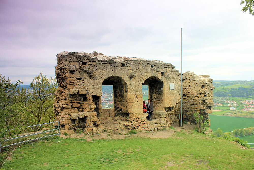 - auf einem Bergsporn über der Saale gelegene Burganlage mit tiefem Halsgraben, Reste eines Bergfrieds und Teile des Mauerwerks erhalten