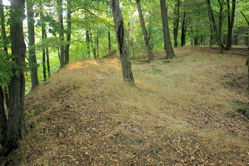 - auf einem Bergsporn über der Freiberger Mulde gelegene Turmhügelburg mit Burghügel und von Wall und Graben umgebener Fläche