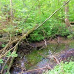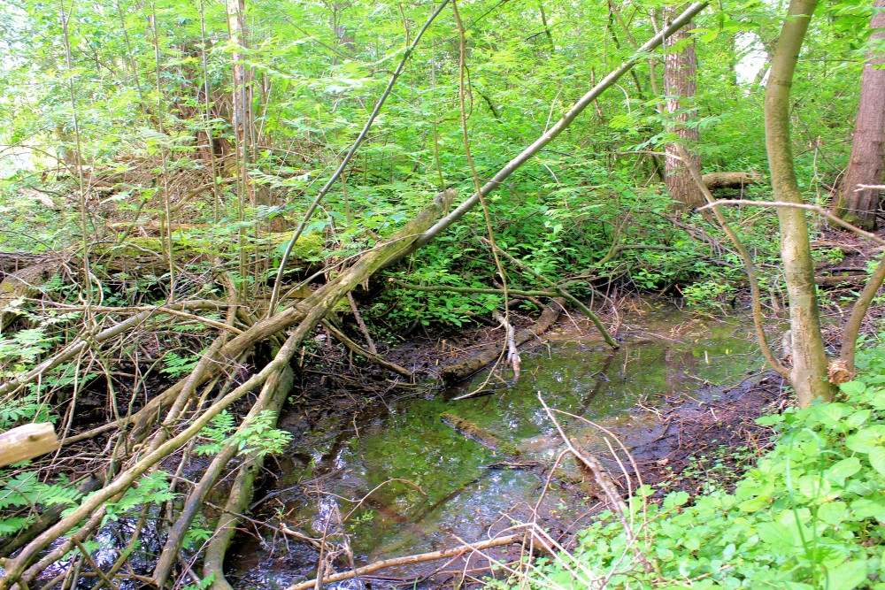 - vermutlich kleine, etwa kreisrunde Wasserburg, umgeben von Wall und Graben