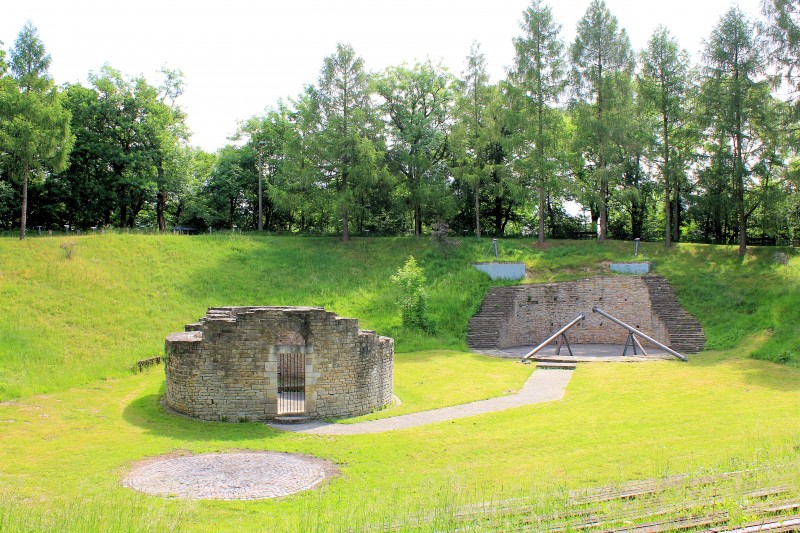 - Stumpf eines Rundturms innerhalb der Wallanlage, Rundkapelle, teilrekonstruiert mit Grundriss zweier ineinander gefügter Kreise (Rundkirche),