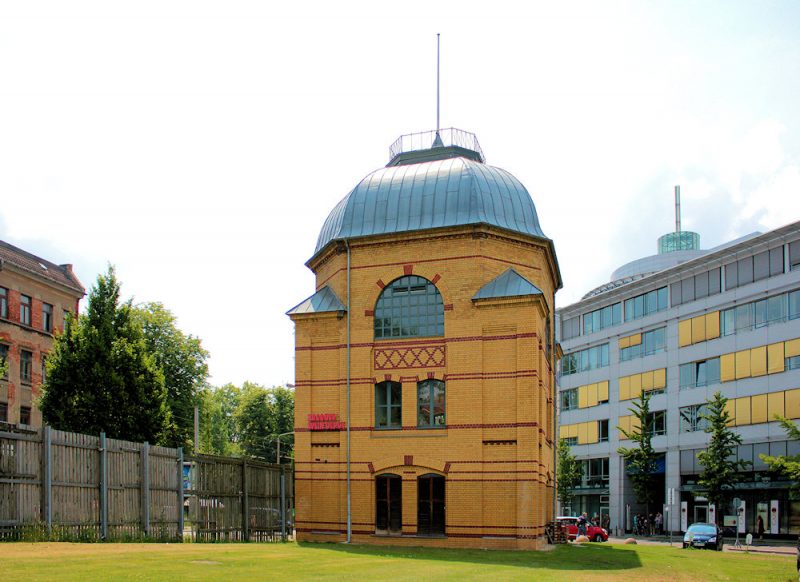 Das ehem. Kontorgebäude Volkmarsdorf steht am Torgauer Platz frei auf einer Grünfläche.