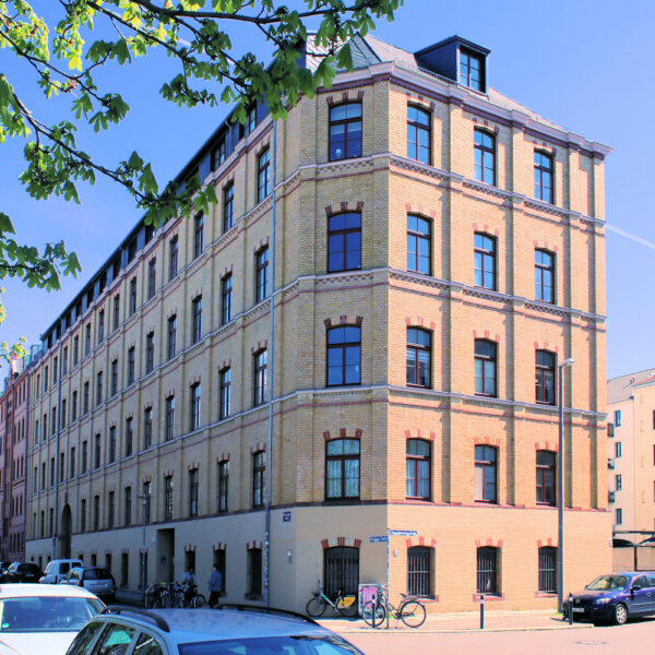 Das Gebäude der ehem. Kunstanstalt Bernhard Grosz steht in geschlossener Blockrandbebauung am Lene-Voigt-Park in Leipzig.