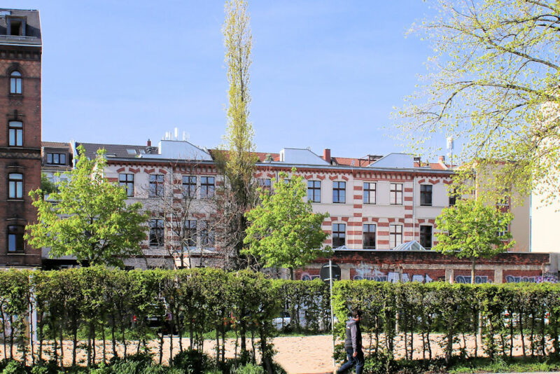 Die ehem. Zuckerwarenfabrik Knape & Würk in Reudnitz steht am Lene-Voigt-Park in Blockrandbebauung.