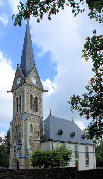 Sandsteinbau, dreiseitiger Schluss, Walmdach mit Satteldachgauben, große Fensterensemble, Sakristei, Westturm mit Runderker, Portal