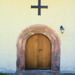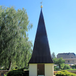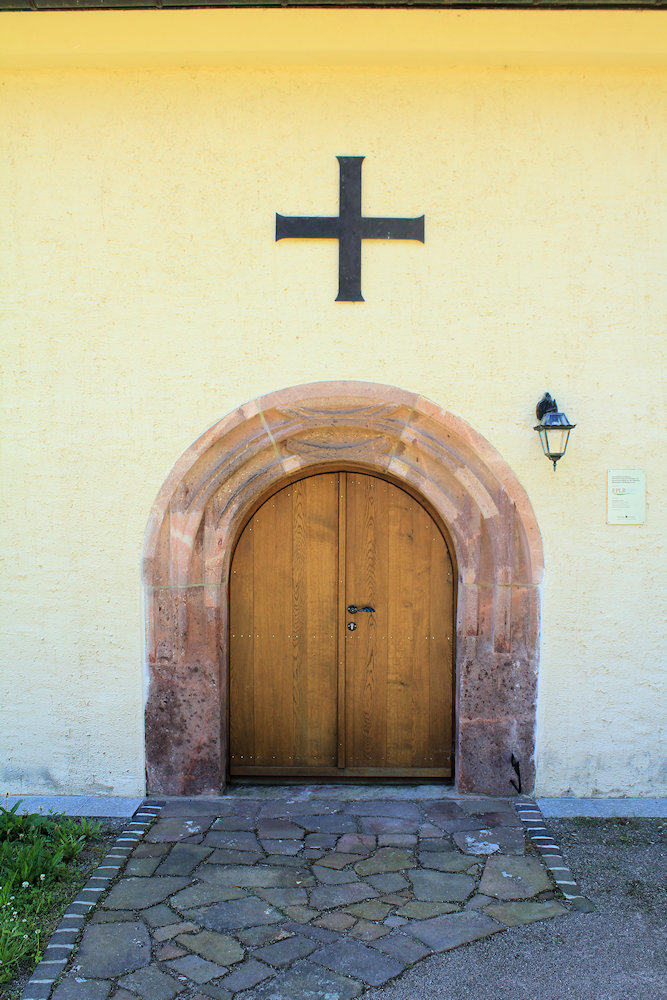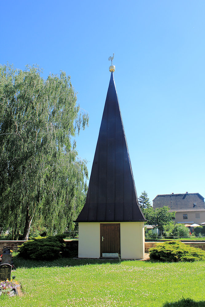 - verputzter Bruchsteinbau, gerader Ostschluss, Rundbogenfenster, Rundbogenportal mit Verstabungen, vor der Kirche kleiner Bau mit spitzen Helm