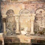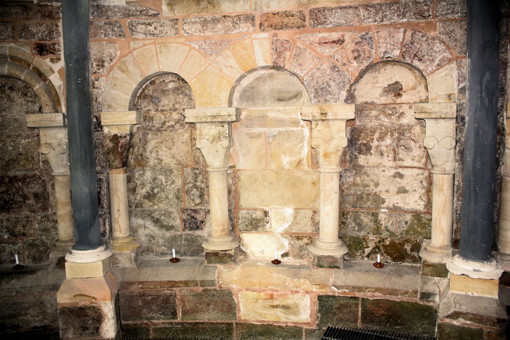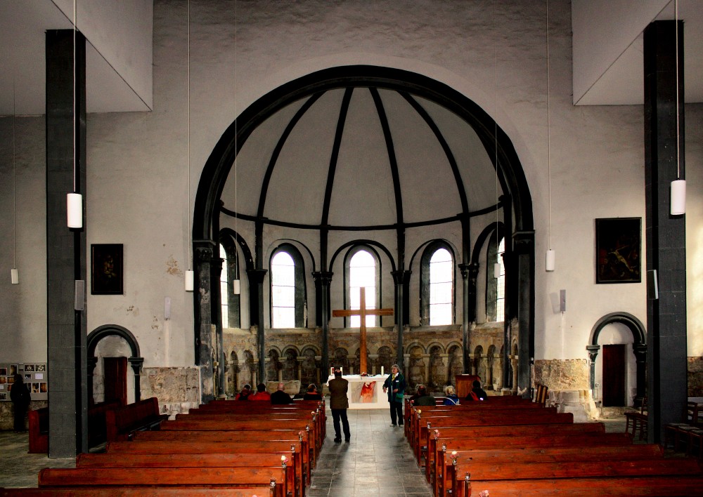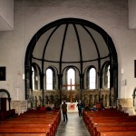 - Altartisch mit Kreuz, Taufstein, Chor mit zweiteiligem Wandaufbau, Blendarkaden, Kuppelgewölbe