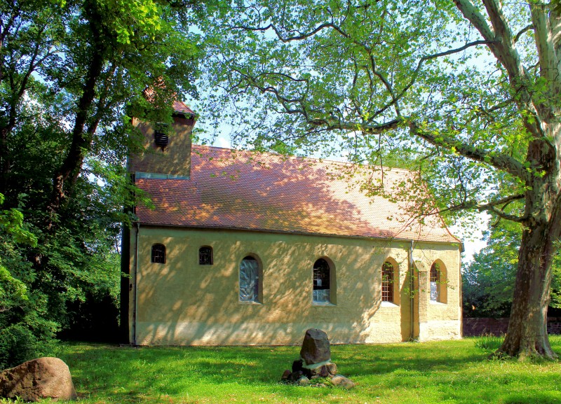 Die Ev. Pfarrkirche in Falkenhain steht neben dem Herrenhaus im Gutspark.