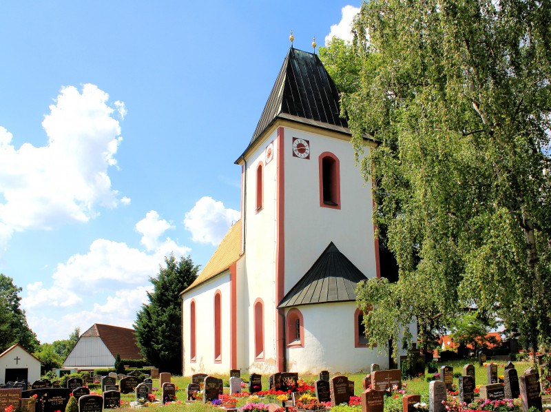 Die Ev. Pfarrkirche in Großpösna steht auf dem Friedhof.