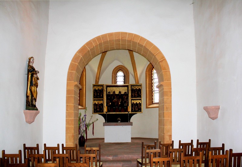 - flachgedeckt, Altar, Chor mit Kreuzrippengewölbe,