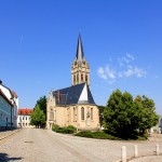 Die Ev. Pfarrkirche in Lucka steht in der Innenstadt auf einem gestalteten Platz.