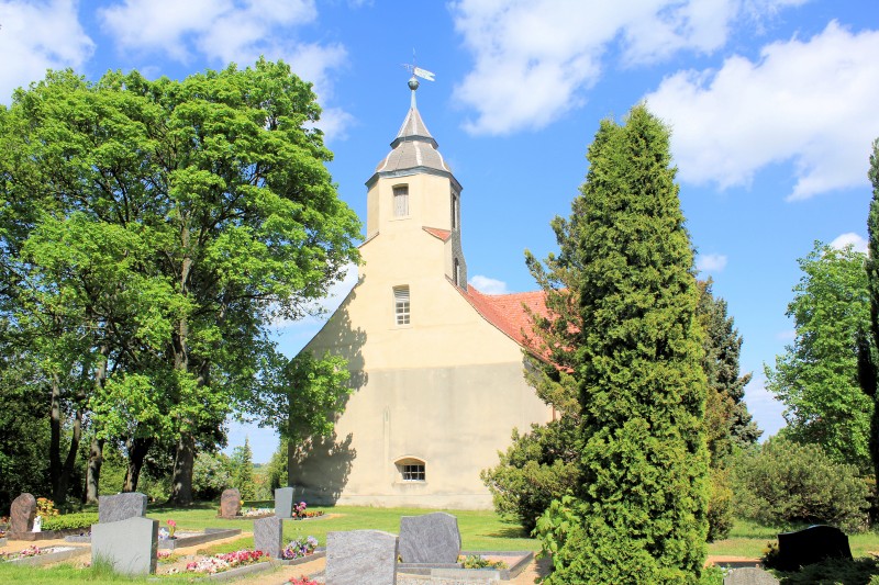 Die Ev. Pfarrkirche in Neußen steht auf dem Friedhof.