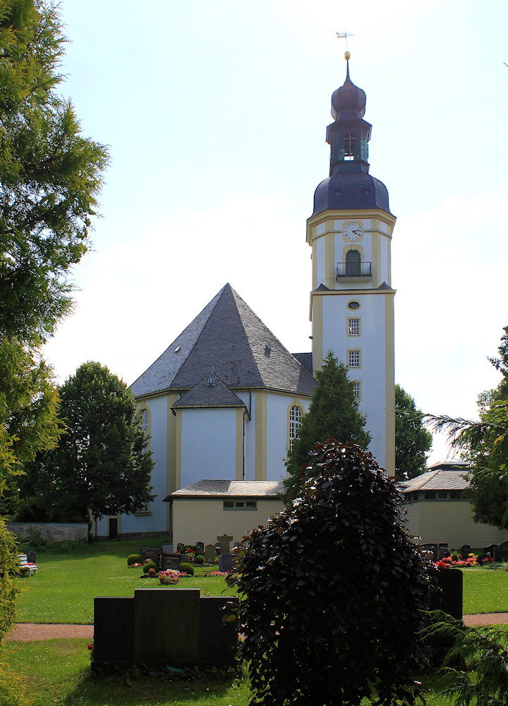 Die Ev. Pfarrkirche in Pretzschendorf steht am Rand des Friedhofs.