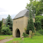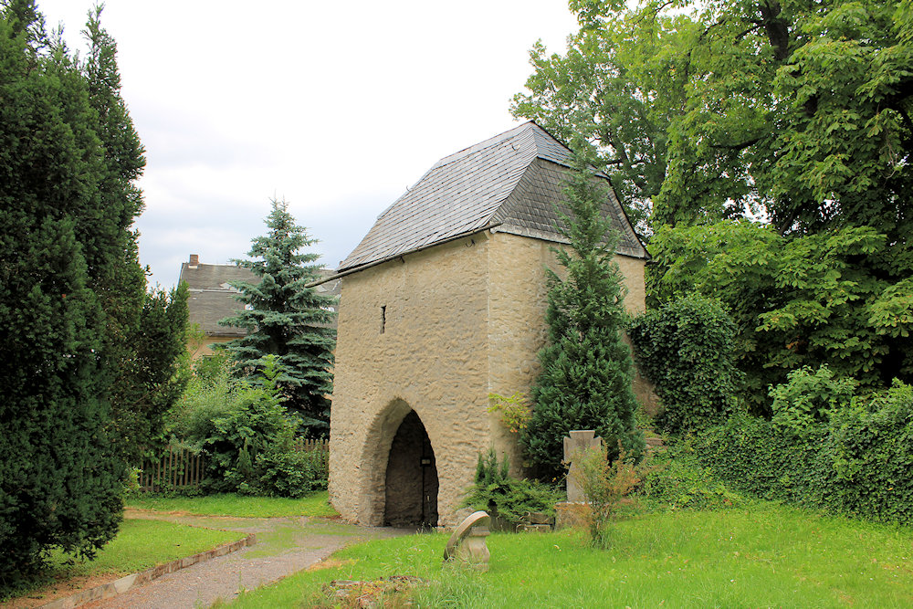 Die Ev. Pfarrkirche in Bockendorf steht auf dem ummauerten Friedhof mit Torhaus.