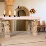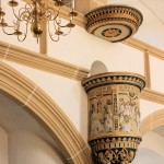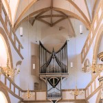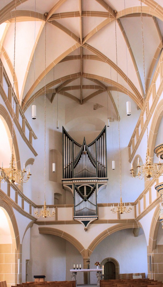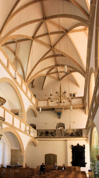 - vierjochig, dreigeschossig, nach innen eingezogene Strebepfeiler, Sterngewölbe, Emporen, Altarmensa, Kanzel, Orgel (Martin Vier)